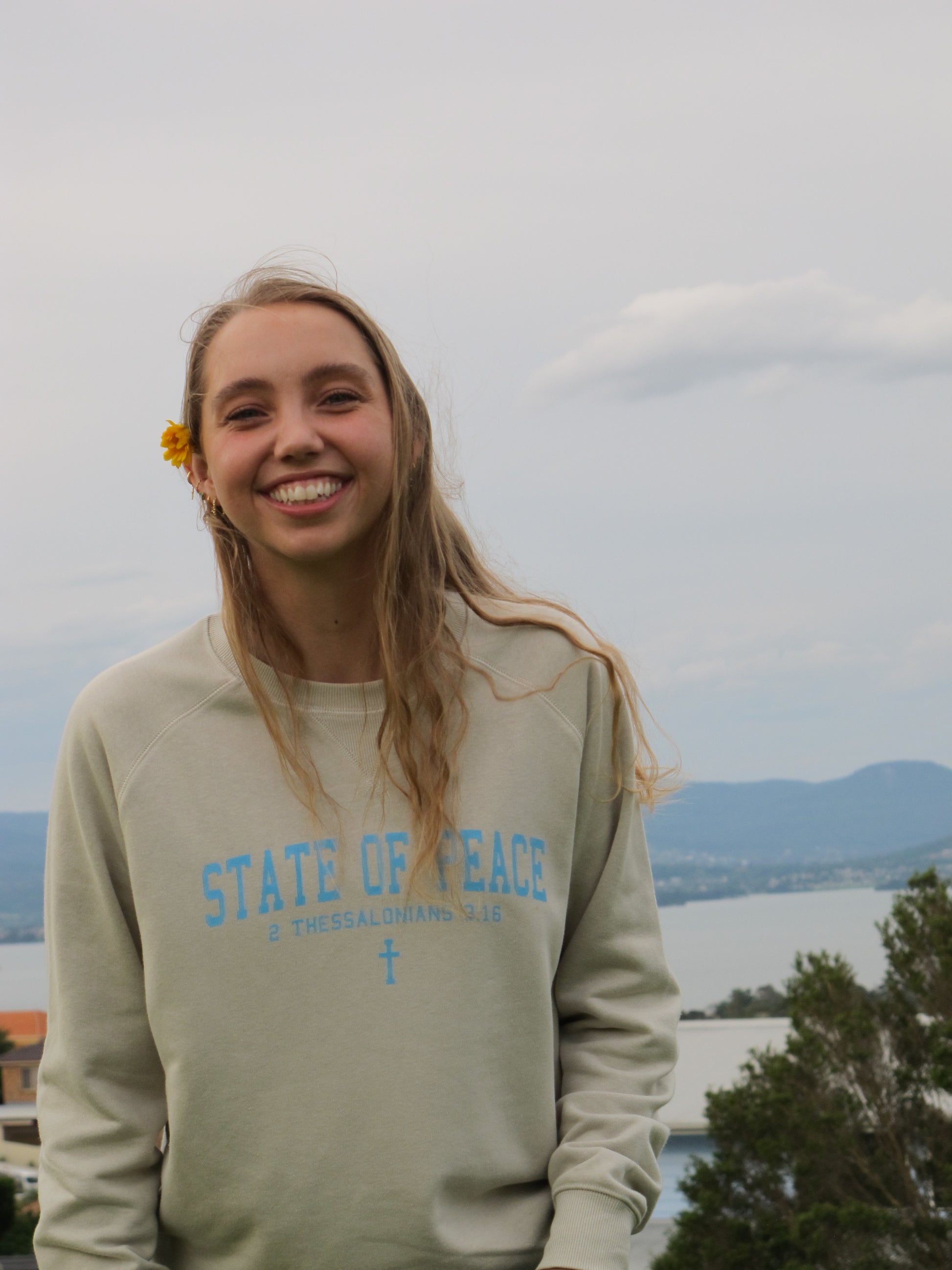 Find calm in the everyday with our sand State of Peace sweatshirt. The soft cotton–poly blend keeps you comfortable while the blue ink brings a confident statement of peace. Effortless to style and designed to remind you where your peace comes from. Wear it and share it.